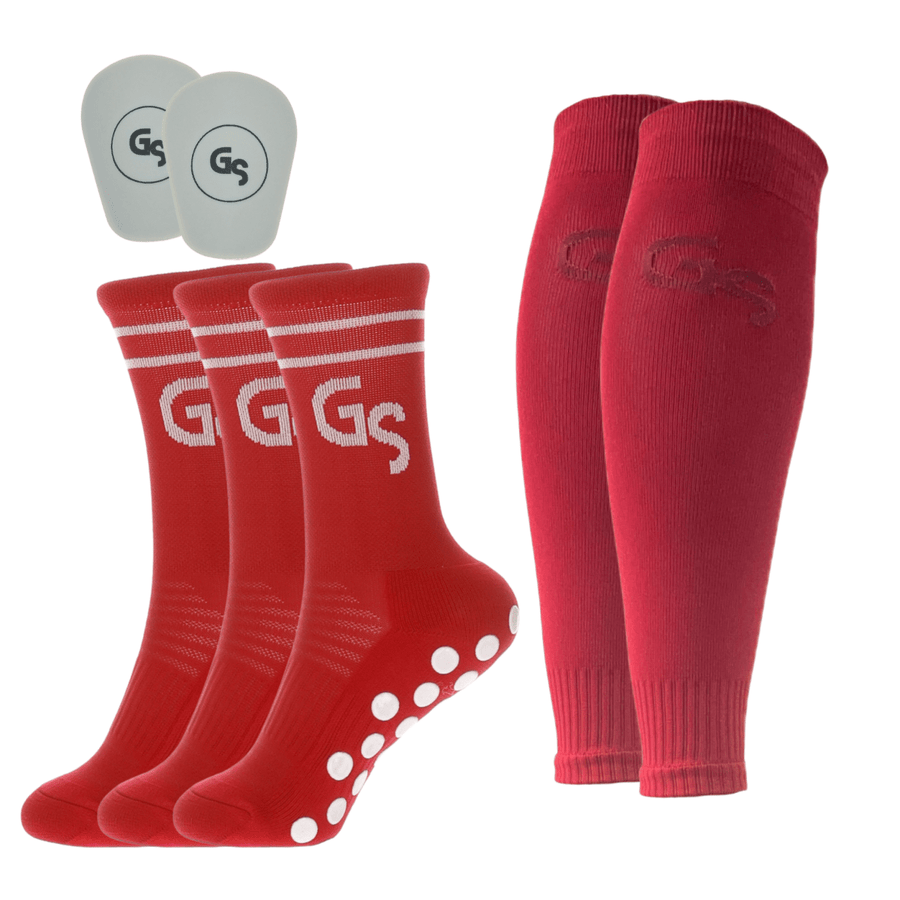 Pakken: Denne pakken inneholder 3par med 2.0 Standard mørke røde gripsokker, 2par med mørke røde Sleeves og mini-leggskinn