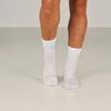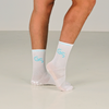 • Tynne hvite gripsokker med turkis logo.